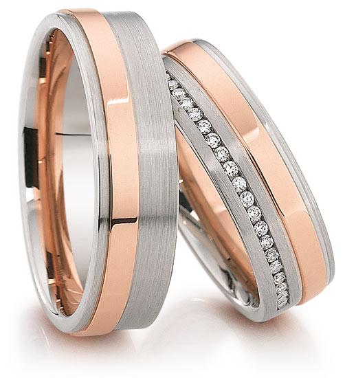 Trauringe 585 Weissgold-Rotgold, 6,50 mm Breite, seidenmatt, 40 Brillanten 0,20 ct. TW/SI,