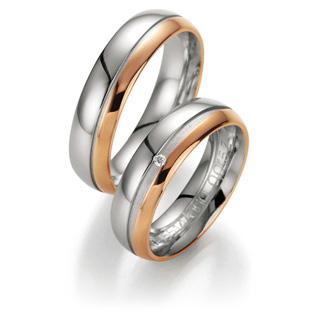 Trauringe 585 Weiss-Rotgold, 6,00mm Breite, poliert / sandmatt, 1 Brillant 0,015 ct. TW/SI,